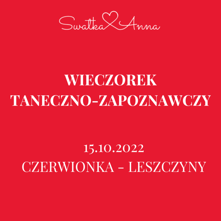 15.10.2022r. Wieczorek Taneczno – Zapoznawczy w Czerwionce-Leszczynach od godz. 18:00 do 23:00, Restauracja Arkadia ul.3 Maja 28, 44-230 Czerwionka-Leszczyny. D.J Przemek Król, dopasowanie partnerskie + mini konsultacje Swatka Anna Kawa + Ciasto cena 60 zł. Konkursy, loterie z nagrodami. *…